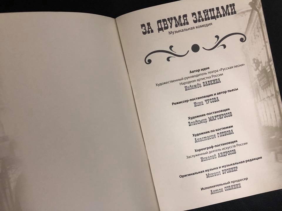 Для Чусовой спектакль «За двумя зайцами» стал третьим опытом работы на сцене театра «Русская песня». Ее постановки «Ночь перед Рождеством» и «Бабий бунт в нашем колхозе» оказались настоящим украшением репертуара.