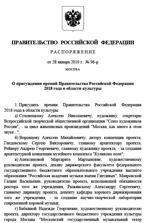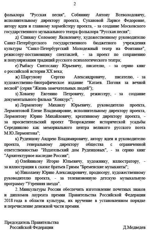 Распоряжением от 28 января 2019 года №96-р за проект «Создание Московского государственного музыкального театра фольклора «Русская песня» премий Правительства РФ удостоены: художественный руководитель проекта, директор театра «Русская песня» Надежда Бабкина, исполнительный директор проекта Антон Собянин, автор идеи и главный хормейстер проекта Лариса Суханова.