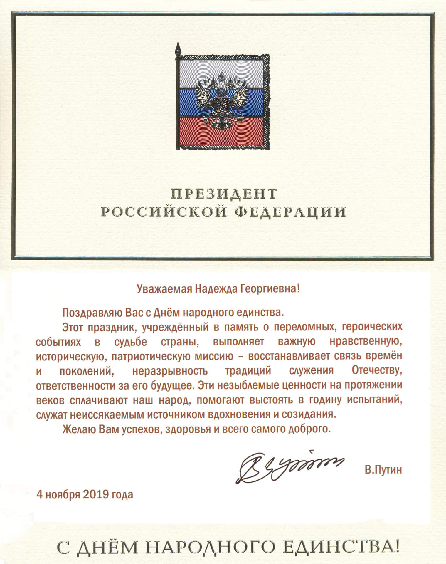«Этот праздник, учрежденный в память о переломных, героических событиях в судьбе страны, выполняет важную нравственную, историческую, патриотическую миссию – восстанавливает связь времён и поколений, неразрывность традиций служения Отечеству, ответственности за его будущее».